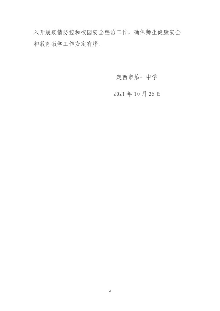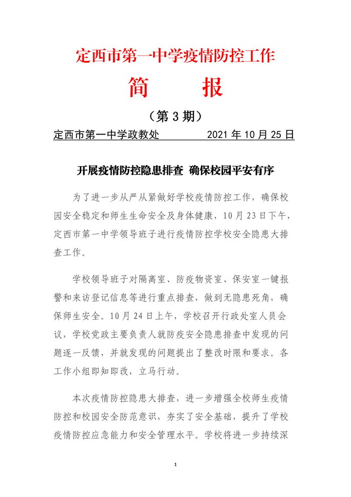 定西市第一中學(xué)疫情防控工作簡報(第3期) 時間:2021-10-25 分類:疫情防控與健康教育 ( 來源:政教處 ) 分享: 上一個: 定西市第一中學(xué)疫情防控工作簡報(第2期) 下一個: 定西市第一中學(xué)疫情防控工作簡報(第4期) 相關(guān)文章 保護視力 ?遠離近視 甲流工作提示 三月健康提示 積極主動作為,全力筑牢校園疫情防控防線 定西一中“兩節(jié)”期間疫情防控工作致全體師生及家長的一封信 市教育局黨組書記、局長盛淑蘭來我校檢查指導(dǎo)疫情防控工作 定西市第一中學(xué)疫情防控工作簡報(第6期) 定西市第一中學(xué)疫情防控工作簡報(第5期)