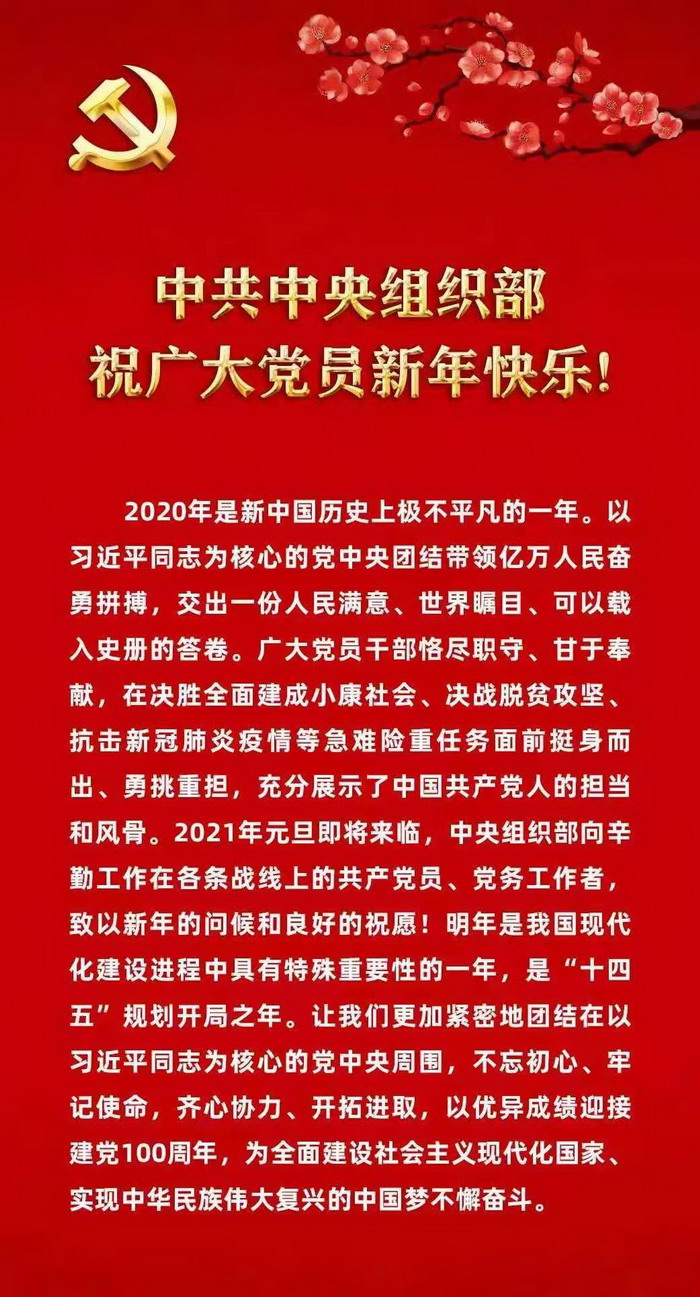 中共中央組織部祝廣大黨員新年快樂 時間:2020-12-31 分類:黨建動態(tài) 分享: 上一個: 碧血成師德 丹心筑師魂 下一個: 習近平同志《論中國共產黨歷史》主要篇目介紹 相關文章 市委第四巡察組向定西一中黨委反饋巡察情況 【“三抓三促”行動進行時】市委第四巡察組巡察定西一中黨委公告 【“三抓三促”行動進行時】市委第四巡察組巡察定西一中黨委工作動員會召開 “弘揚踐行教育家精神”系列微黨課 【“三抓三促”行動進行時】德潤桃李,言啟智慧——定西市第一中學舉辦2024年“強師德 鑄師魂”演講比賽 【“三抓三促”行動進行時】緬懷先烈啟新程,黨日活動溫誓詞——定西市第一中學黨委赴會寧開展主題黨日活動 我校召開2023-2024第二學期工作安排暨全面從嚴治黨工作大會 “行走的大思政課”——走進城市展覽館,感受新時代十年偉大變革