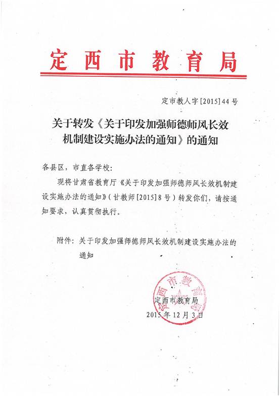 關(guān)于轉(zhuǎn)發(fā)《關(guān)于印發(fā)加強師德師風長效機制建設(shè)實施辦法的通知》的通知 時間:2015-12-14 分類:政策文件 分享: 下一個: 關(guān)于做好甘肅省“十三五”2016年度教育科學規(guī)劃課題申報立項工作的通知 相關(guān)文章 重磅!國家關(guān)于規(guī)范黨員干部網(wǎng)絡(luò)行為6條意見來了 關(guān)于組織參加2021年應(yīng)急普法知識競賽的通知 關(guān)于轉(zhuǎn)發(fā)甘肅省人民政府教育督導委員會辦公室關(guān)于組織開展對省級人民政府履行教育職責情況滿意度調(diào)查的通知 關(guān)于激活使用醫(yī)保電子憑證的通知 定西市第一中學預(yù)防學生欺凌和校園不良網(wǎng)絡(luò)貸款專項整治行動實施方案 關(guān)于開展2019年“一師一優(yōu)課、一課一名師”活動的通知 《新時代中小學教師職業(yè)行為十項準則》全文 教育部關(guān)于印發(fā)《中小學教師違反職業(yè)道德 行為處理辦法(2018年修訂)》的通知