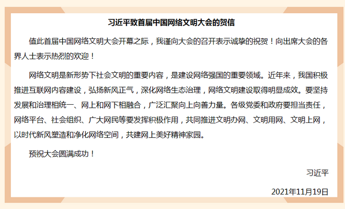 首屆中國網(wǎng)絡(luò)文明大會召開,習(xí)近平致信祝賀!