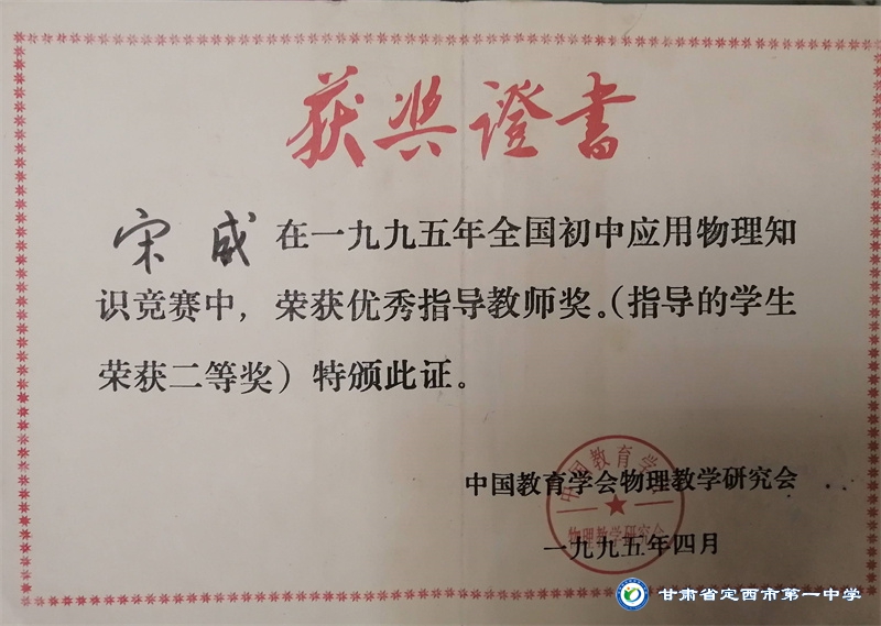 宋威老師一直工作于教學(xué)第一線,任務(wù)重,工作量大,任勞任怨。他在備課,講課,輔導(dǎo),批改作業(yè)等教學(xué)環(huán)節(jié)上非常認(rèn)真,教法靈活多樣,教學(xué)效果良好,深受學(xué)生歡迎,曾多次被定西市一中、中共安定區(qū)委、安定區(qū)人民政府,中共定西市委、定西市人民政府評(píng)為校級(jí)、縣級(jí)、市級(jí)優(yōu)秀教師。在1996年,1997年,2003年分別被學(xué)校評(píng)為優(yōu)秀教師,2004年被學(xué)校評(píng)為優(yōu)秀教研組長,2013年在定西一中舉辦的多媒體課件大賽中獲得三等獎(jiǎng)。2012年獲得由定西市教育局和定西市高等教育自學(xué)考試工作委員會(huì)頒發(fā)的“全市高等教育自學(xué)考試優(yōu)秀監(jiān)考”榮譽(yù)證書。2012年9月和2013年9月兩次被中共安定區(qū)區(qū)委、定西市安定區(qū)人民政府,評(píng)為全“全區(qū)優(yōu)秀教師”, 2016年9月被中共定西市委、定西市人民政府評(píng)為“定西市優(yōu)秀教師”。