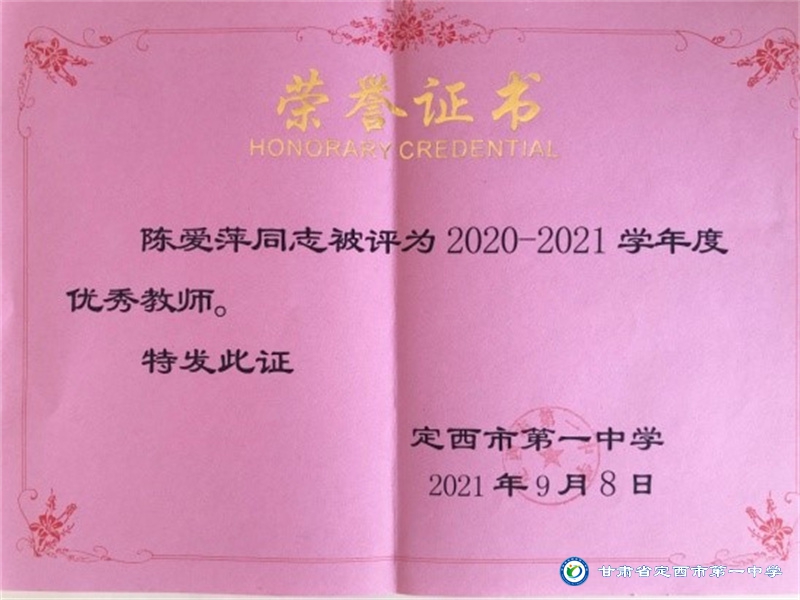 陳愛萍,定西市第一中學(xué)高級教師,英語教研組組長。1993年畢業(yè)于西北師大外語系,同年進(jìn)入定西市第一中學(xué)工作。從教近30年,先后獲得“定西市骨干教師”、“定西市青年教學(xué)能手”、“全國中學(xué)生英語能力競賽優(yōu)秀輔導(dǎo)教師”等榮譽(yù)。