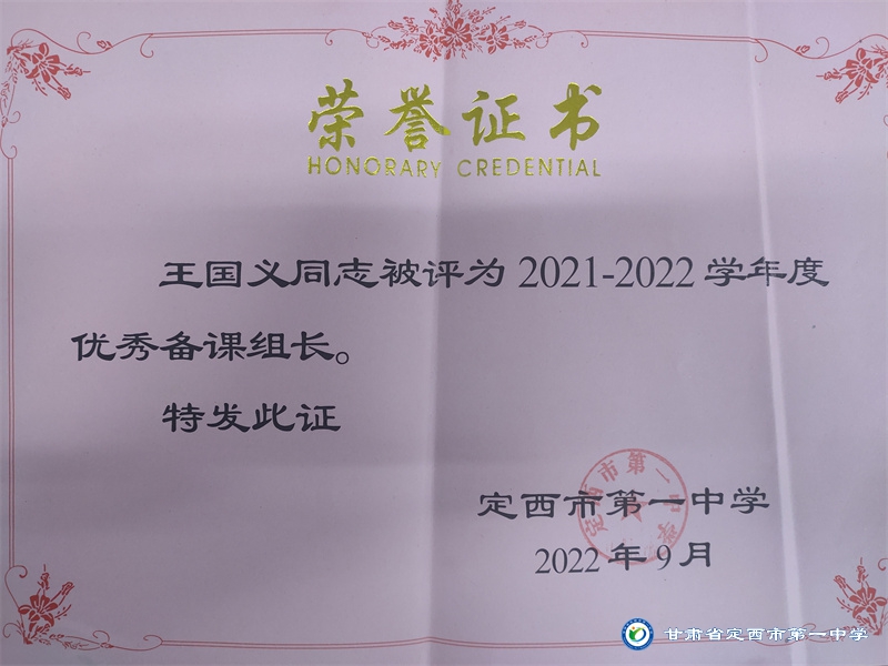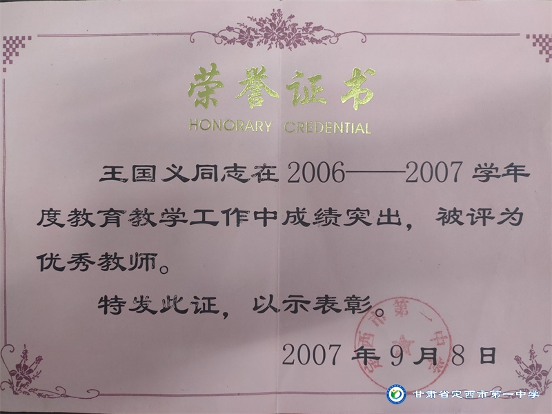王國義,男,漢族,大學(xué)本科學(xué)歷,定西一中高級(jí)教師,從教27年始終在教育一線擔(dān)任歷史教學(xué)及班主任工作。默默無聞,潛心教書的他,從不爭榮譽(yù)的評(píng)選,只在用實(shí)際行動(dòng)回饋學(xué)校、家長和學(xué)生。先后多次獲得市、縣、校級(jí)優(yōu)秀教師和優(yōu)秀班主任稱號(hào),并在教學(xué)活動(dòng)中多次擔(dān)任評(píng)委,真正踐行著“一棵樹搖動(dòng)另一棵樹,一朵云推動(dòng)另一朵云,一個(gè)靈魂喚醒另一個(gè)靈魂”的教育本質(zhì)。
