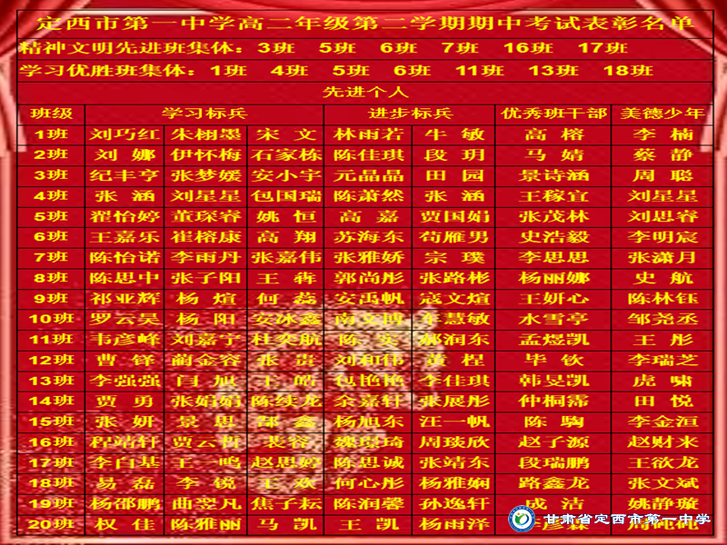 這次大會表彰了高二1班等7個學(xué)習(xí)優(yōu)勝班集體,高二3班等6個精神文明班集體,劉巧紅等60名學(xué)習(xí)標(biāo)兵,劉雨若等20名學(xué)習(xí)進步標(biāo)兵,高榕等20名優(yōu)秀班干部,李楠等20名美德少年。隨后,與會領(lǐng)導(dǎo)分別為獲得各項榮譽的班級與個人頒發(fā)獎狀。