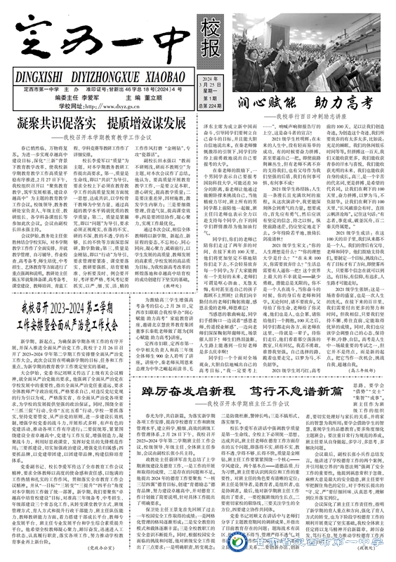 【“三抓三促”行動進行時】定西一中校報2024年第一期 時間:2024-03-25 分類:三抓三促/ 校報???/a> (撰稿:董立順 審核:陳玉琴 田永強 監(jiān)審:肖進雄) 定西一中校報2024年第一期下載 分享: 上一個: 【“三抓三促”行動進行時】聚焦學科競賽 ?助力選優(yōu)培優(yōu) 下一個: 【“三抓三促”行動進行時】喜報—我校學子在第20屆“外研社杯”全國中學生外語素養(yǎng)大賽中榮獲佳績 相關(guān)文章 【區(qū)域聯(lián)動 眾行致遠】智慧共享 ?智研共贏 【研經(jīng)悟理 授業(yè)傳道】廣學集智逐光行,求變則通耘夢田 【“三抓三促”行動進行時】定西一中校報2025年第八期 【“三抓三促”行動進行時】師徒同心展匠心 青藍攜手綻芳華 【“三抓三促”行動進行時】幫扶搭臺連校際 互鑒同行共育人 【“三抓三促”行動進行時】區(qū)域聯(lián)動促深度交流?攜手并進謀共同發(fā)展 【“三抓三促”行動進行時】喜報——我校學子在2025年全國中學生數(shù)學奧林匹克競賽甘肅賽區(qū)聯(lián)賽中榮獲佳績 【“三抓三促”行動進行時】細耕常規(guī) 智研共進