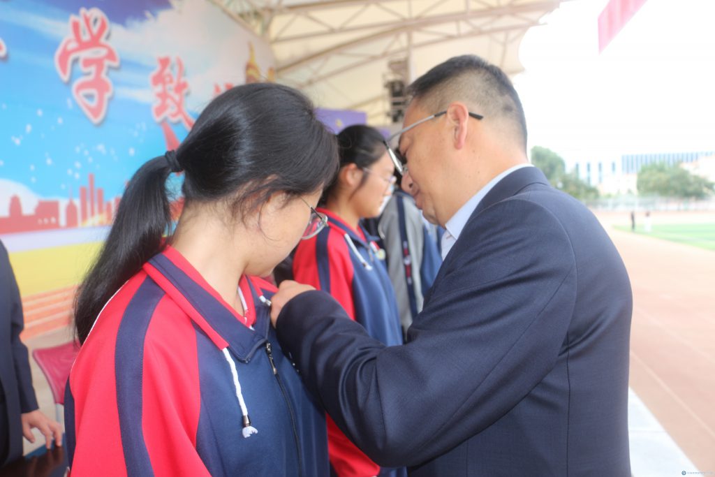 接著,李校長為新生代表佩戴校徽,小小的校徽承載著學(xué)校的期望與傳承,標(biāo)志著新生們正式成為定西市第一中學(xué)的一員。