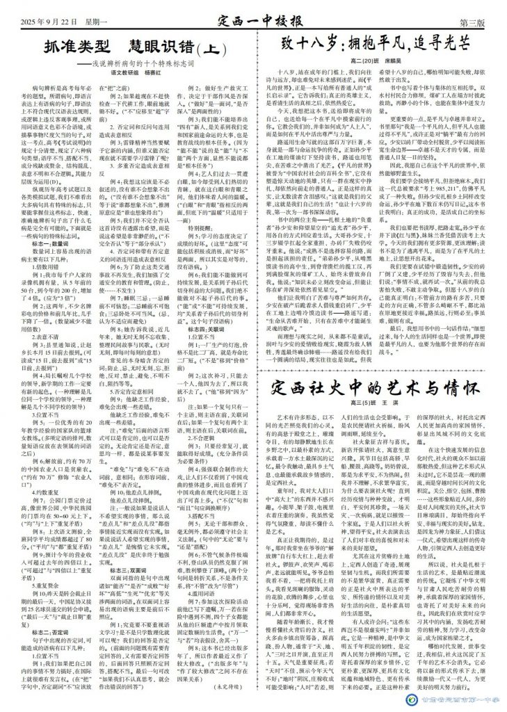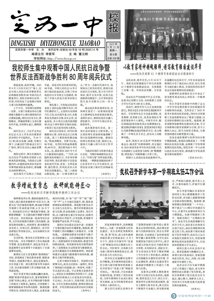 【“三抓三促”行動進行時】定西一中校報2025年第六期 時間:2025-09-23 分類:三抓三促/ 校報???/a> (撰稿:董立順 審核:王景龍 田永強 監(jiān)審:水晶) 定西一中校報2025年第六期下載 分享: 上一個: 【“三抓三促”行動進行時】四省聯(lián)袂研考路 共繪備考新藍(lán)圖 下一個: 【“三抓三促”行動進行時】聚名師智慧 ?賦能備高考 相關(guān)文章 【“三抓三促”行動進行時】筑基強師涵養(yǎng)匠心 示范引領(lǐng)共繪宏圖 【“三抓三促”行動進行時】聚名師智慧 ?賦能備高考 【“三抓三促”行動進行時】四省聯(lián)袂研考路 共繪備考新藍(lán)圖 【“三抓三促”行動進行時】喜報——我校教師在2025年全市中小學(xué)基礎(chǔ)教育精品課遴選活動中榮獲佳績 【“三抓三促”行動進行時】教學(xué)增效重常態(tài)?教研賦能鑄匠心 【“三抓三促”行動進行時】喜報——我校學(xué)子在2024—2025學(xué)年全國版圖知識競賽(中小學(xué)組)活動中榮獲佳績 【“三抓三促”行動進行時】喜報——我校學(xué)子在2025年全國中學(xué)生生物學(xué)競賽甘肅賽區(qū)聯(lián)賽中榮獲佳績 【“三抓三促”行動進行時】定西一中校報2025年第五期